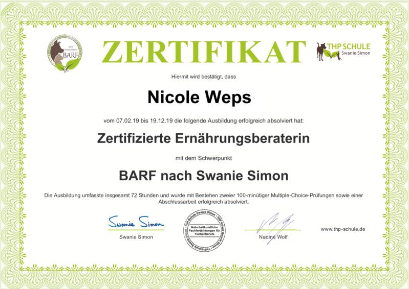 Stolz darauf mein bisheriges Wissen erweitert, vertieft und letztenlich in einer Abschlussprüfung und Abschlussarbeit erfolgreich unter Beweis gestellt zu haben und damit eine zertifizierte Ernährungsberaterin nach Swansie Simon & Nadine Wolf zu sein.Nun freue mich, dich und Ihr Hund künftig kompetent beraten und idividuelle Futterpläne erstellen zu können.