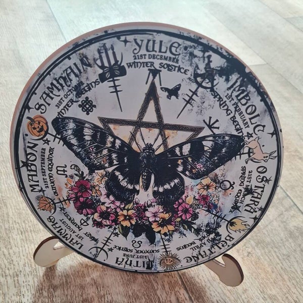 Der liebevoll gestaltete und auf Holz gemalte Hexenkalender (Wicca Rad) zeigt alle wichtigen Jahreskreisfeste auf einen Blick.