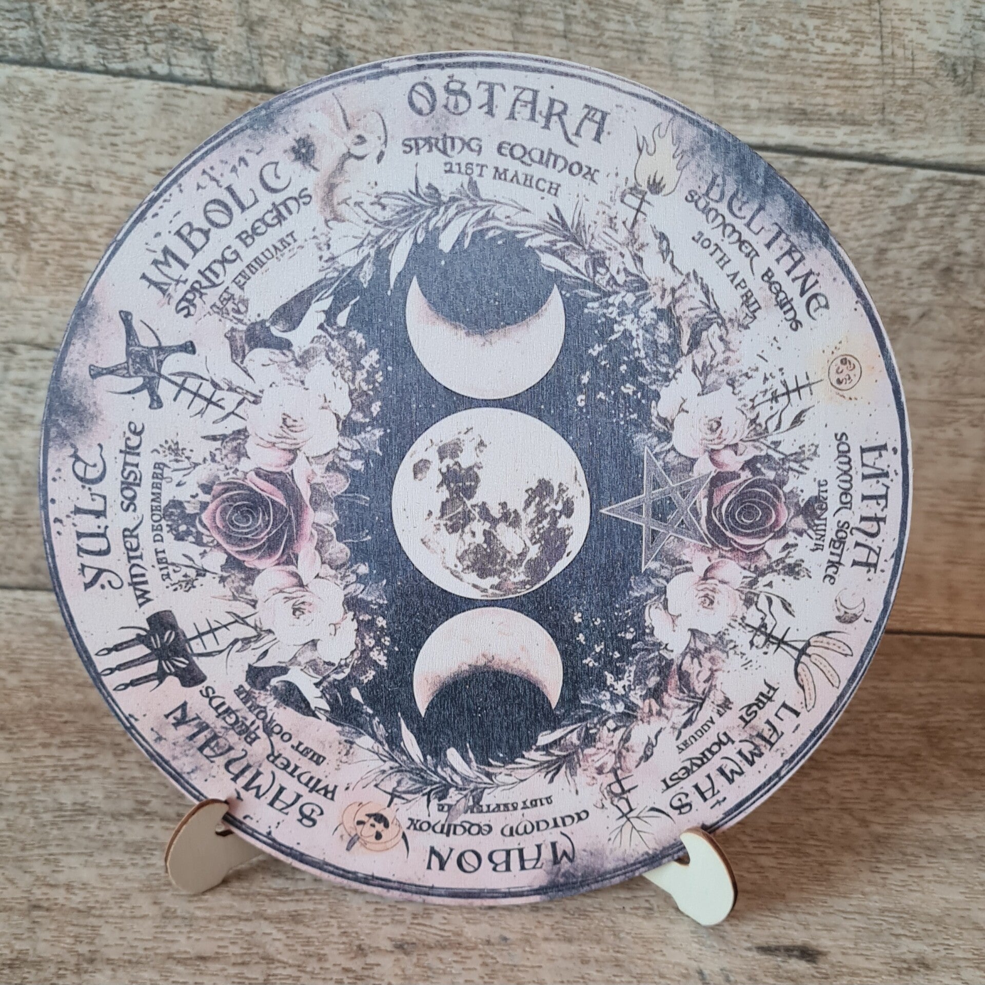 Der liebevoll gestaltete und auf Holz gemalte Hexenkalender (Wicca Rad) zeigt alle wichtigen Jahreskreisfeste auf einen Blick.