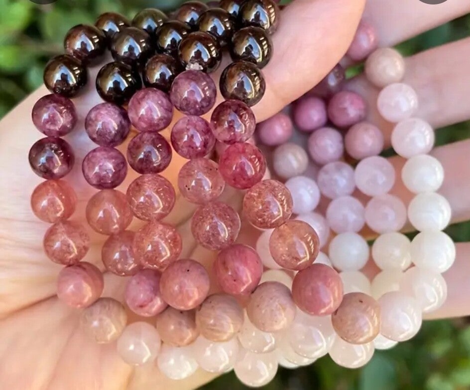 Das wunderschöne Armband aus Rosenquarzm Rhodin und Mondstein zieht Liebe an und repräsentiert die Selbstliebe.