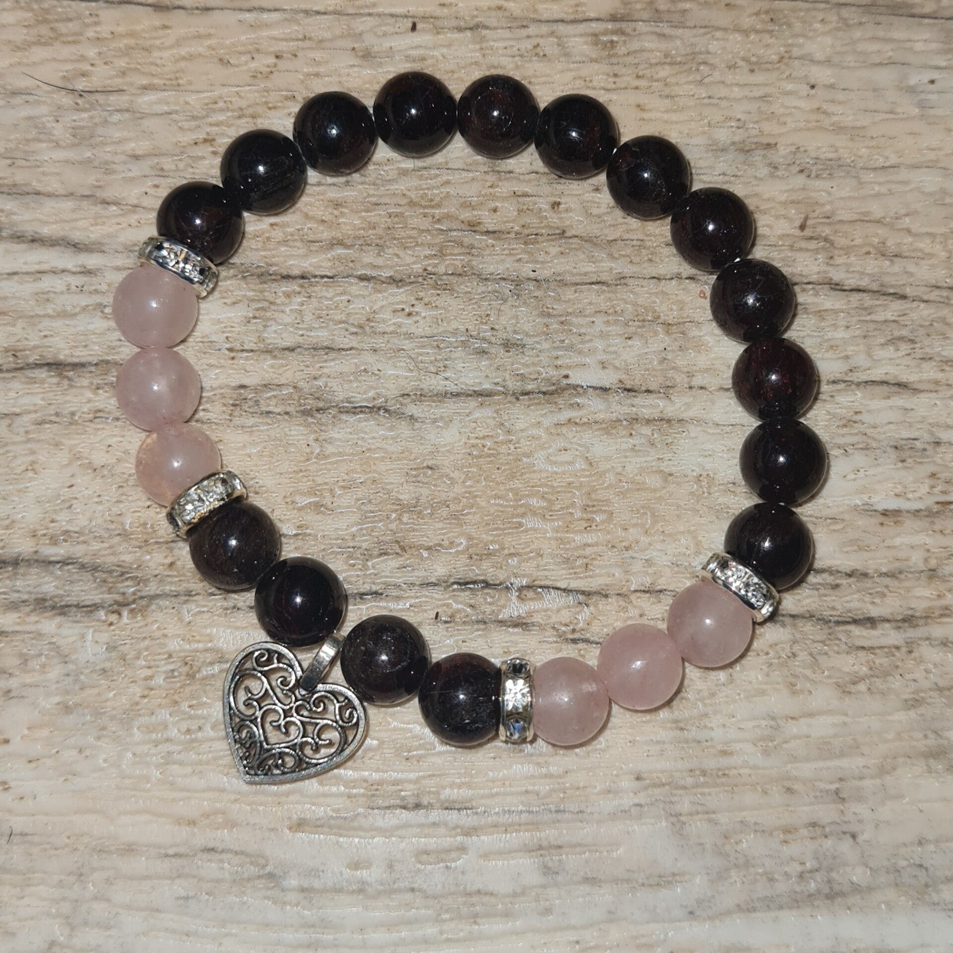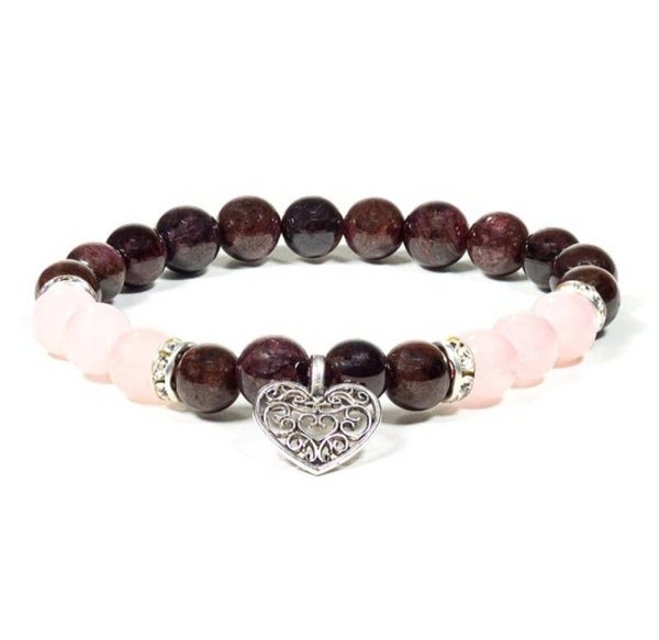 Ein wunderschönes Armband mit Granat und Rosenquarz, geziert mit einem wunderschönen herzförmigen Charme.